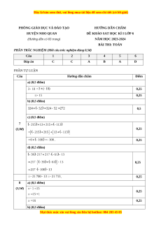 PHẦN TRẮC NGHIỆM (Mỗi câu trắc nghiệm đúng 0,5đ) Câu 1 2 3 4 5 6 Đáp án C C A B A D PHẦN TỰ LUẬN Câu Hướng dẫn chấm Điểm a) (0,5 điểm) 0,25 0,25 b) (0,5 điểm) 0,5 c) (0,5 điểm) 7 (2,0đ) 0,25 . 0,25 d) (0,5 điểm) 0,25 . 0,25 8 a) (0,5 điểm) (1,5đ) 0,25 0,25 b) (0,5 điểm)