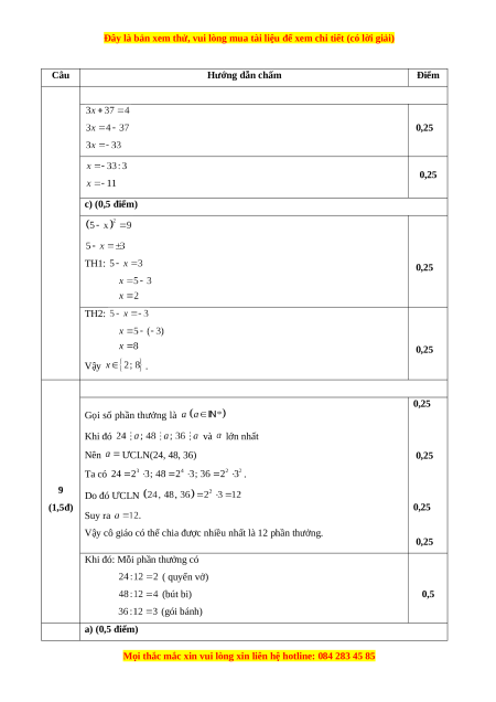 Gọi số phần thưởng là Khi đó và lớn nhất Nên ƯCLN(24, 48, 36) 0,25 Ta có . 9 Do đó ƯCLN (1,5đ) 0,25 Suy ra