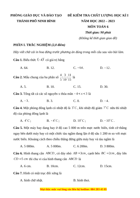 Đề thi cuối kì 1 Toán 6 Cánh diều Phòng GD&ĐT Thành phố Ninh Bình