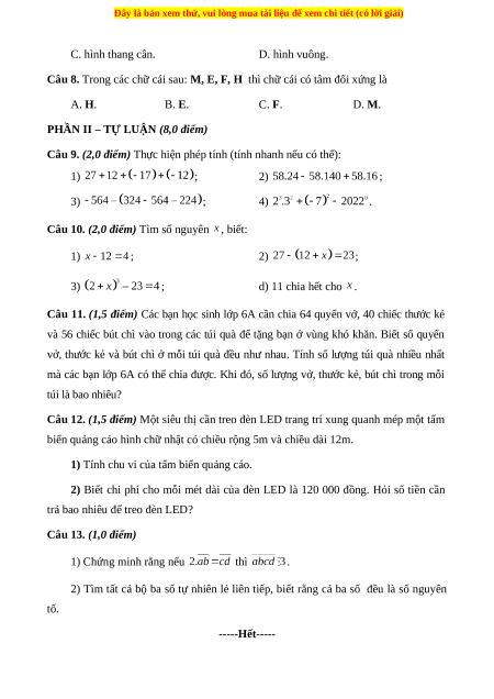 Câu 8. Trong các chữ cái sau: M, E, F, H thì chữ cái có tâm đối xứng là A. H. B. E. C. F. D. M.
