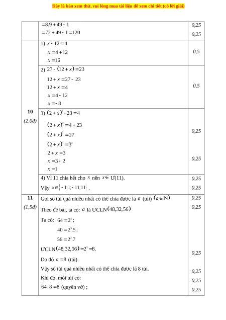 (1,5đ) Theo đề bài, ta có: là ƯCLN 0,25 Ta có: ; ; ƯCLN 0,25 Do đó (túi).