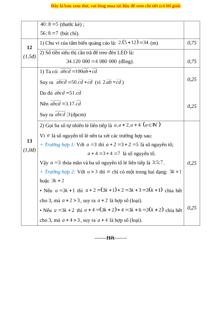 2) Tìm tất cả bộ ba số tự nhiên lẻ liên tiếp, biết rằng cả ba số đều là số nguyên tố. -----Hết-----