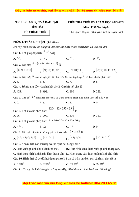 Đề thi cuối kì 1 Toán 6 Cánh diều Phòng GD&ĐT Tiền Hải - Thái Bình
