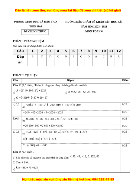 HƯỚNG DẪN CHẤM ĐỀ KHẢO SÁT HỌC KÌ I TIỀN HẢI NĂM HỌC 2023 - 2024 ĐỀ CHÍNH THỨC MÔN TOÁN 6