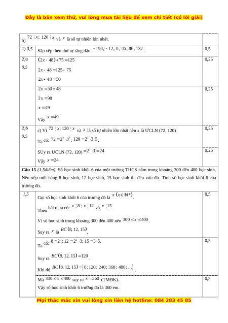 Câu 15 (1,5điểm). Số học sinh khối 6 của một trường THCS nằm trong khoảng 300 đến 400 học