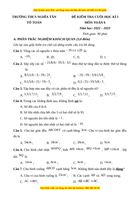 Đề thi cuối kì 1 Toán 6 Cánh diều trường THCS Nghĩa Tân - Quận Cầu Giấy - TP Hà Nội