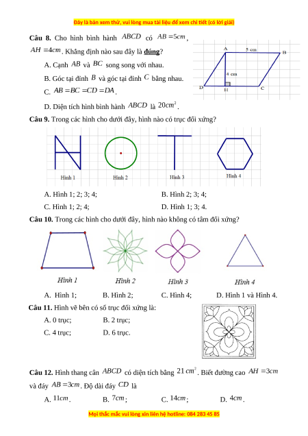 Câu 9. Trong các hình cho dưới đây, hình nào có trục đối xứng? A. Hình 1; 2; 3; 4; B. Hình 2; 3; 4; C. Hình 1; 2; 4; D. Hình 1; 3; 4.