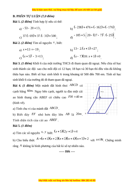 Bài 3. (1 điểm) Khối 6 của một trường THCS đi tham quan dã ngoại. Nếu chia số học