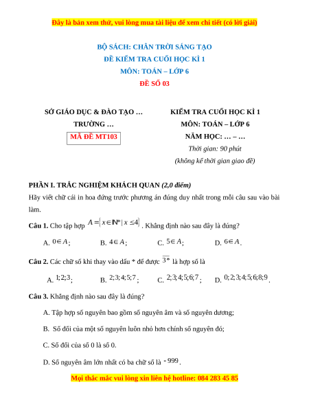 KIỂM TRA CUỐI HỌC KÌ 1 TRƯỜNG … MÔN: TOÁN – LỚP 6 MÃ ĐỀ MT103 NĂM HỌC: … – … Thời gian: 90 phút