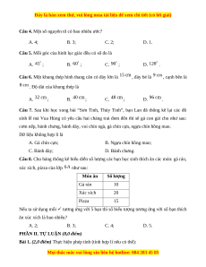 Câu 8. Cho bảng thống kê biểu diễn số lượng các bạn học sinh thích ăn các món: gà rán, xúc xích, pizza của lớp như sau: Món ăn Số lượng Gà rán 10 Xúc xích 20 Pizza 15