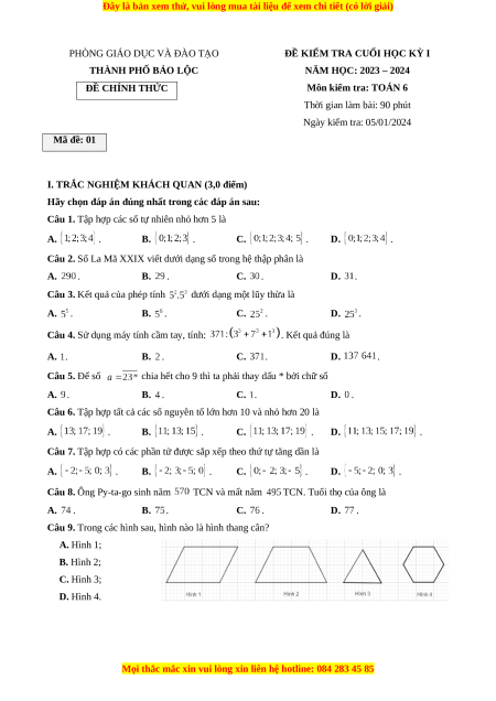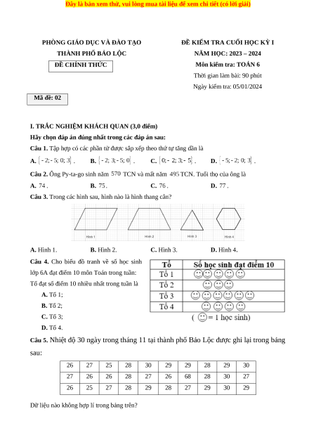 Đề thi cuối kì 1 Toán 6 Chân trời sáng tạo Phòng GD&ĐT Bảo Lộc - Lâm Đồng