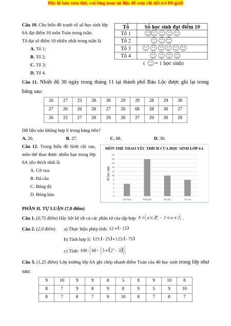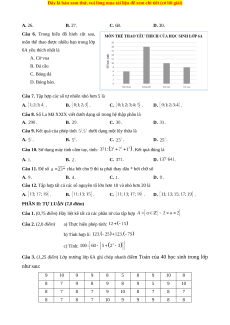 Câu 3. (1,25 điểm) Lớp trưởng lớp 6A ghi chép nhanh điểm Toán của 40 học sinh trong lớp như sau: 9 10 9 9 8 5 8 9 10 8 8 7 9 8 9 8 9 5 9 10 8 7 8 7 9 10 8 7 8 7