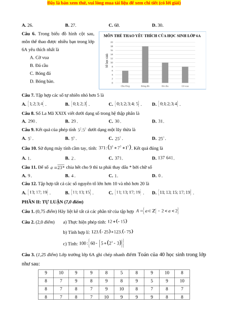 Câu 5. Nhiệt độ 30 ngày trong tháng 11 tại thành phố Bảo Lộc được ghi lại trong bảng sau: 26 27 25 28 30 29 29 28 29 30 27 26 26 28 27 26 68 28 30 27 26 25 27 28 29 28 27 29 30 29