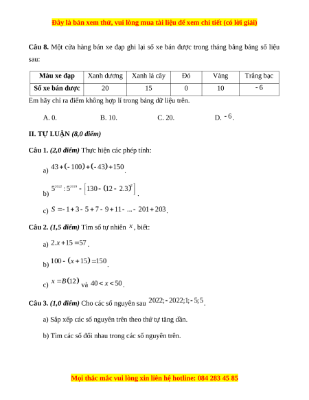 Câu 3. (1,0 điểm) Cho các số nguyên sau .