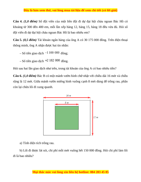 Câu 6. (1,0 điểm) Bác B có một mảnh vườn hình chữ nhật với chiều dài 16 mét và chiều