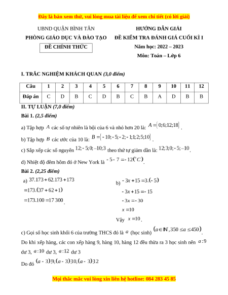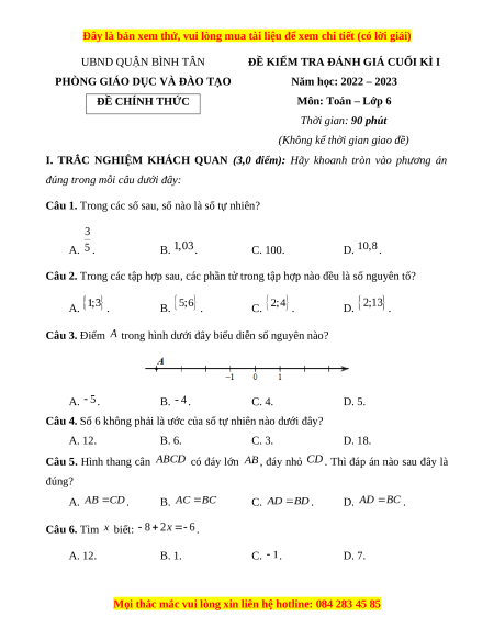 Đề thi cuối kì 1 Toán 6 Chân trời sáng tạo Phòng GD&ĐT Quận Bình Tân - TP HCM