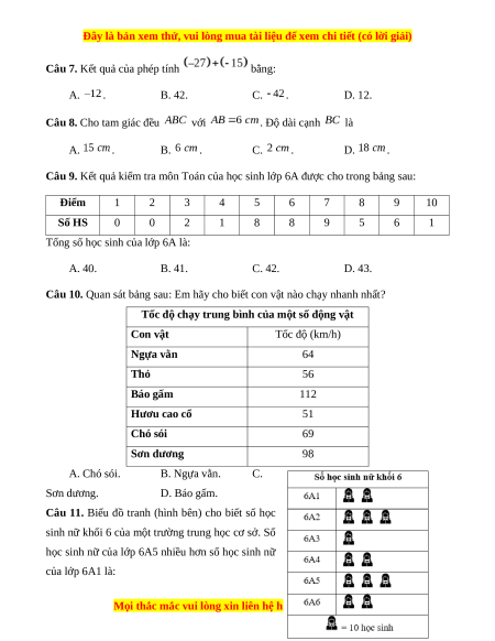 Câu 9. Kết quả kiểm tra môn Toán của học sinh lớp 6A được cho trong bảng sau: Điểm 1 2 3 4 5 6 7 8 9 10 Số HS 0 0 2 1 8 8 9 5 6 1