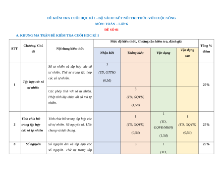 ĐỀ KIỂM TRA CUỐI HỌC KÌ 1 - BỘ SÁCH: KẾT NỐI TRI THỨC VỚI CUỘC SỐNG MÔN: TOÁN – LỚP 6 ĐỀ SỐ 01