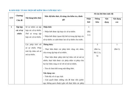 B. BẢN ĐẶC TẢ MA TRẬN ĐỀ KIỂM TRA CUỐI HỌC KÌ 1