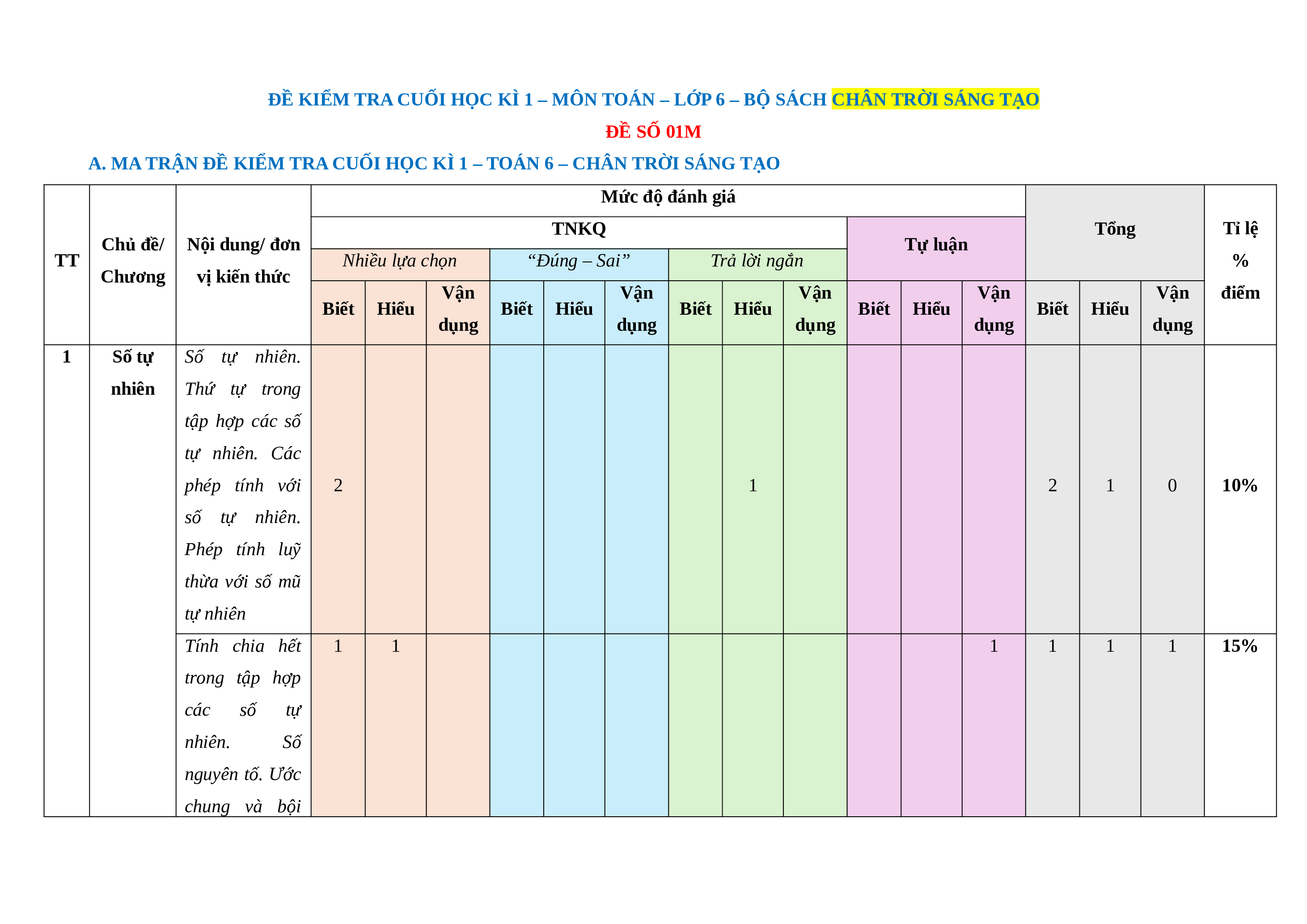 A. MA TRẬN ĐỀ KIỂM TRA CUỐI HỌC KÌ 1 – TOÁN 6 – CHÂN TRỜI SÁNG TẠO Mức độ đánh giá TNKQ Tổng Tỉ lệ