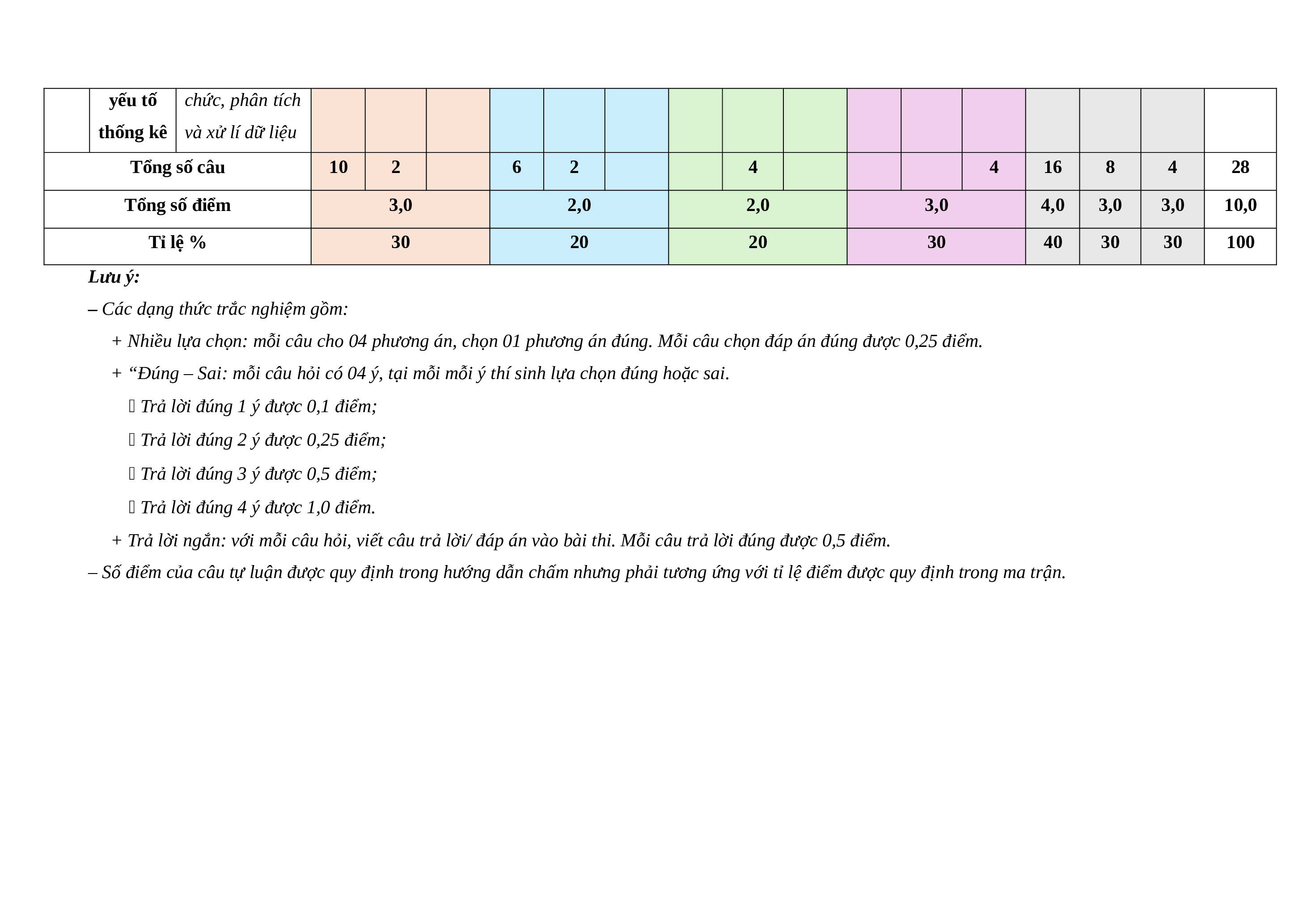 thống kê và xử lí dữ liệu Tổng số câu 10 2 6 2 4 4 16 8 4 28 Tổng số điểm 3,0 2,0 2,0 3,0 4,0 3,0 3,0 10,0 Tỉ lệ % 30 20 20 30 40 30 30 100 Lưu ý: