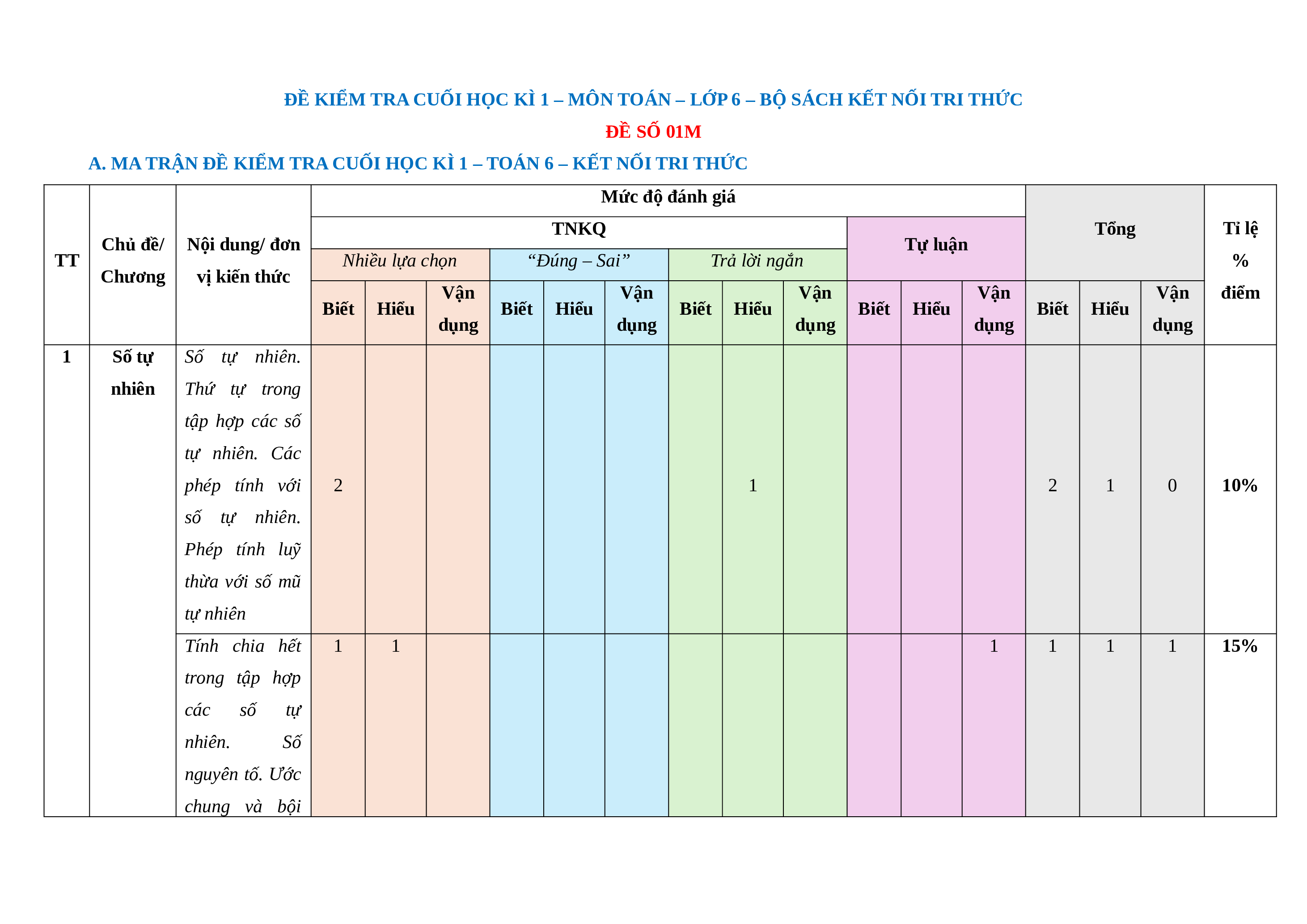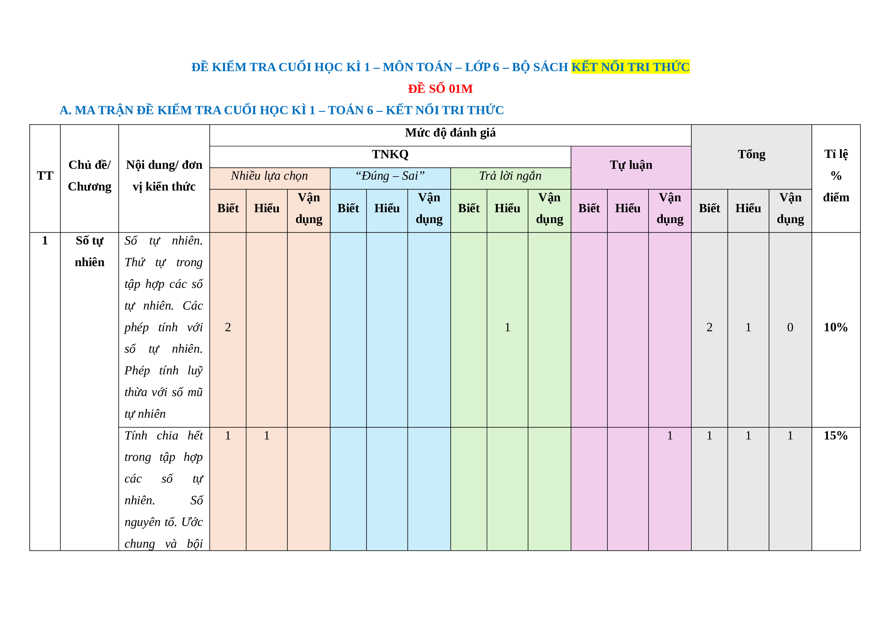 A. MA TRẬN ĐỀ KIỂM TRA CUỐI HỌC KÌ 1 – TOÁN 6 – KẾT NỐI TRI THỨC Mức độ đánh giá TNKQ Tổng Tỉ lệ
