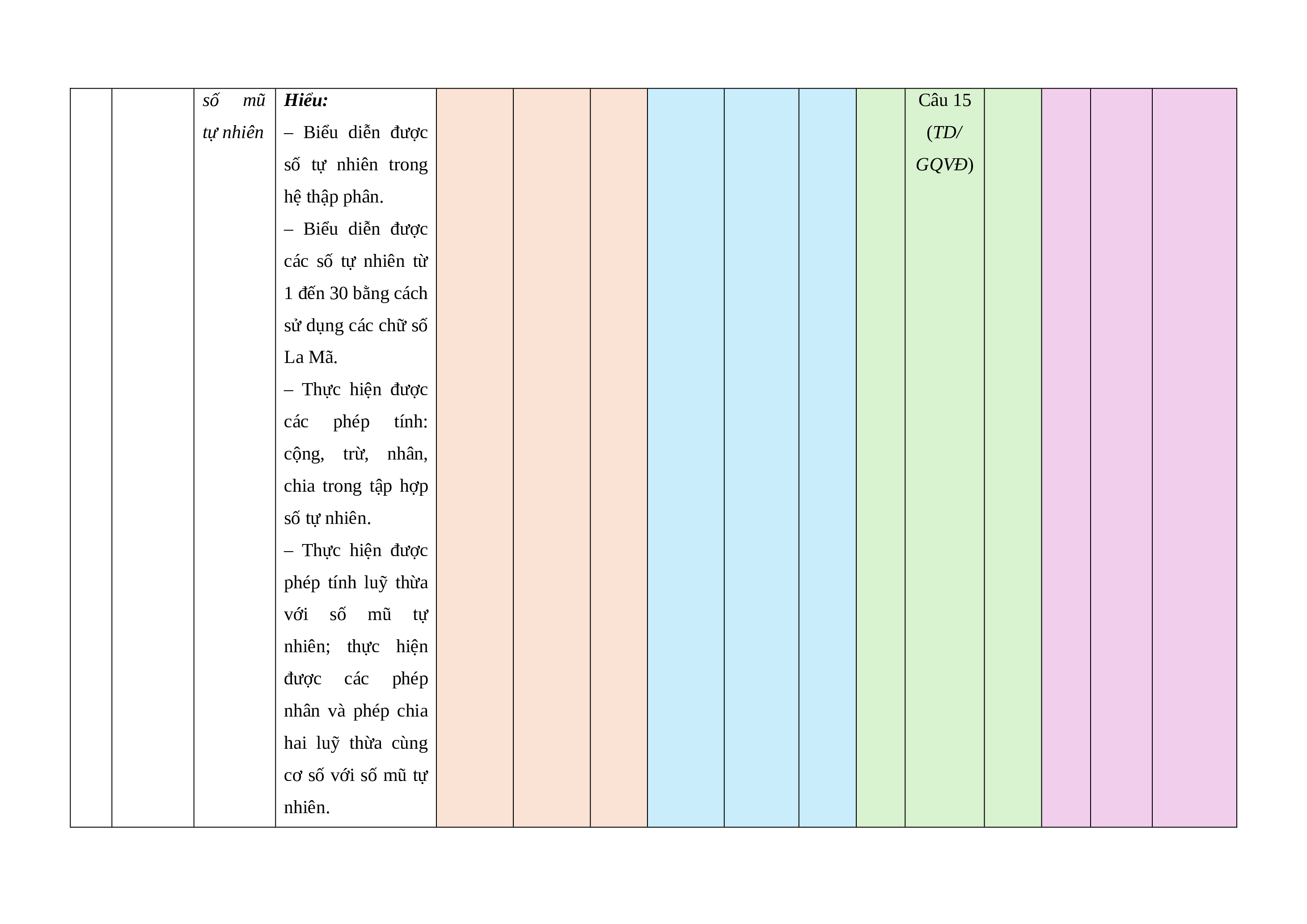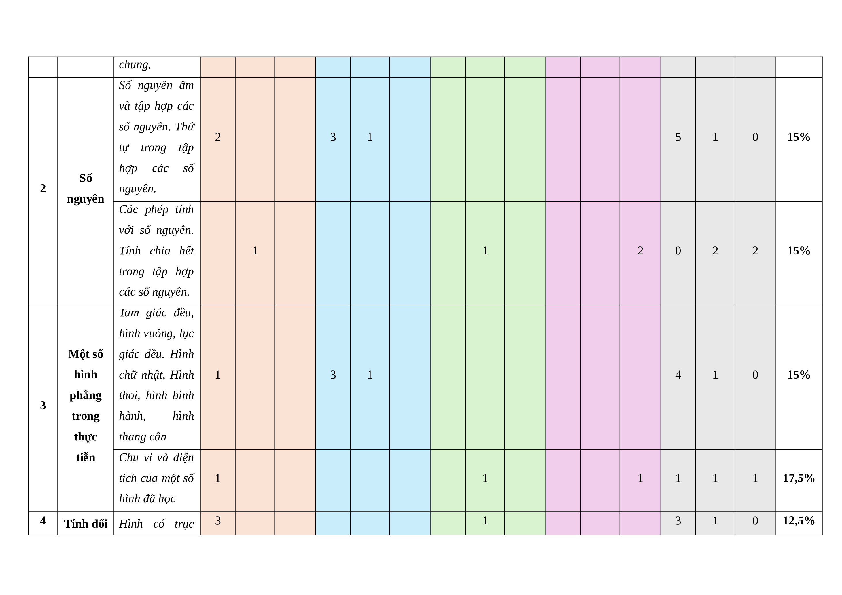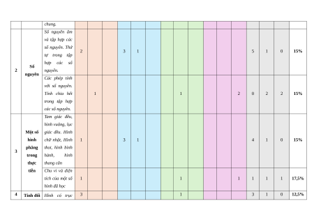 Chủ đề/ Nội dung/ đơn Tự luận TT Nhiều lựa chọn “Đúng – Sai” Trả lời ngắn % Chương vị kiến thức Vận Vận Vận Vận Vận điểm Biết Hiểu Biết Hiểu Biết Hiểu Biết Hiểu Biết Hiểu dụng dụng dụng dụng dụng 1 Số tự Số tự nhiên. nhiên Thứ tự trong tập hợp các số tự nhiên. Các phép tính với 2 1 2 1 0 10% số tự nhiên. Phép tính luỹ thừa với số mũ tự nhiên Tính chia hết 1 1 1 1 1 1 15% trong tập hợp các số tự nhiên. Số nguyên tố. Ước chung và bội chung. Số nguyên âm và tập hợp các số nguyên. Thứ 2 3 1 5 1 0 15% tự trong tập hợp các số Số 2 nguyên. nguyên Các phép tính với số nguyên. Tính chia hết 1 1 2 0 2 2 15% trong tập hợp các số nguyên. Tam giác đều, hình vuông, lục