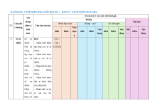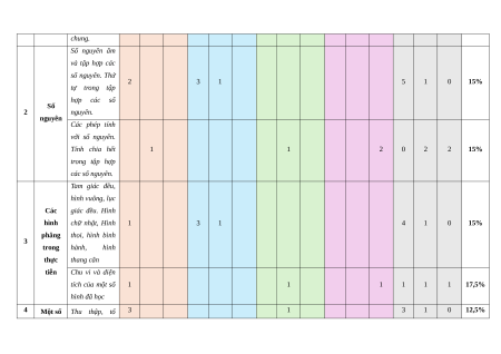 Chủ đề/ Nội dung/ đơn Tự luận TT Nhiều lựa chọn “Đúng – Sai” Trả lời ngắn % Chương vị kiến thức Vận Vận Vận Vận Vận điểm Biết Hiểu Biết Hiểu Biết Hiểu Biết Hiểu Biết Hiểu dụng dụng dụng dụng dụng 1 Số tự Số tự nhiên. nhiên Thứ tự trong tập hợp các số tự nhiên. Các phép tính với 2 1 2 1 0 10% số tự nhiên. Phép tính luỹ thừa với số mũ tự nhiên Tính chia hết 1 1 1 1 1 1 15% trong tập hợp các số tự nhiên. Số nguyên tố. Ước chung và bội chung. Số nguyên âm và tập hợp các số nguyên. Thứ 2 3 1 5 1 0 15% tự trong tập hợp các số Số 2 nguyên. nguyên Các phép tính với số nguyên. Tính chia hết 1 1 2 0 2 2 15% trong tập hợp các số nguyên. Tam giác đều, hình vuông, lục Các giác đều. Hình hình chữ nhật, Hình 1 3 1 4 1 0 15% phẳng thoi, hình bình 3 trong hành, hình thực thang cân tiễn Chu vi và diện tích của một số 1 1 1 1 1 1 17,5% hình đã học 4