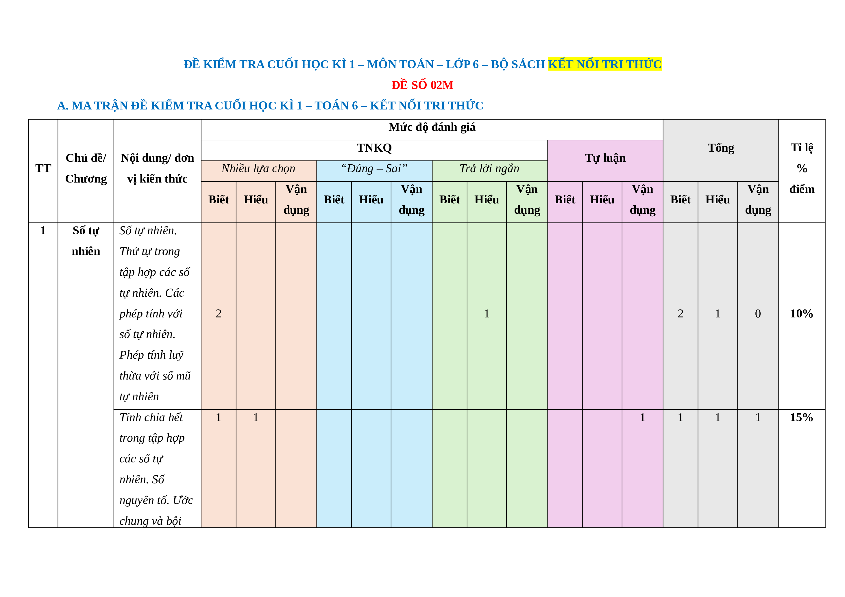 A. MA TRẬN ĐỀ KIỂM TRA CUỐI HỌC KÌ 1 – TOÁN 6 – KẾT NỐI TRI THỨC Mức độ đánh giá TNKQ Tổng Tỉ lệ
