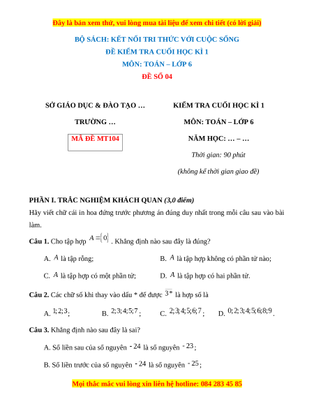 KIỂM TRA CUỐI HỌC KÌ 1 TRƯỜNG … MÔN: TOÁN – LỚP 6 MÃ ĐỀ MT104 NĂM HỌC: … – … Thời gian: 90 phút