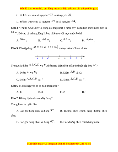 Câu 6. Một số nguyên tố có bao nhiêu ước? A. 4; B. 3; C. 2; D. 1.