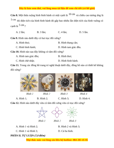 Câu 9. Hình nào dưới đây có hai trục đối xứng? A. Hình thoi; B. Hình thang cân; C. Hình bình hành; D. Hình tam giác đều.
