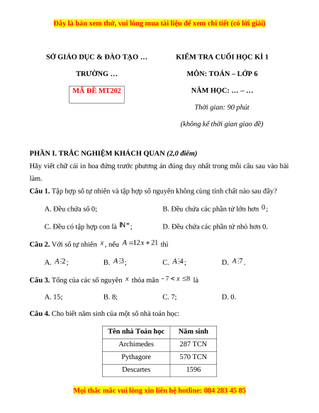 KIỂM TRA CUỐI HỌC KÌ 1 TRƯỜNG … MÔN: TOÁN – LỚP 6 MÃ ĐỀ MT202 NĂM HỌC: … – … Thời gian: 90 phút