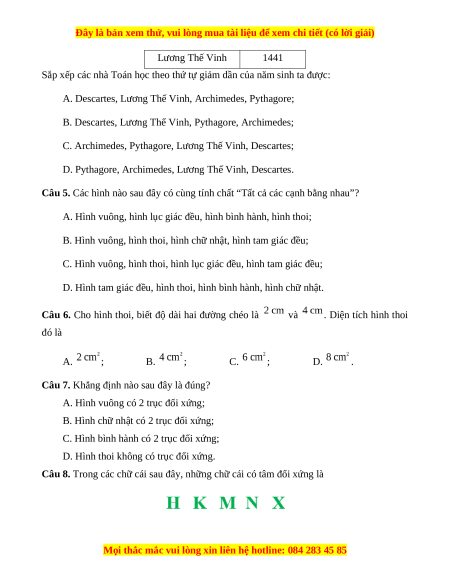 Câu 4. Cho biết năm sinh của một số nhà toán học: Tên nhà Toán học Năm sinh Archimedes 287 TCN Pythagore 570 TCN Descartes 1596