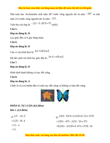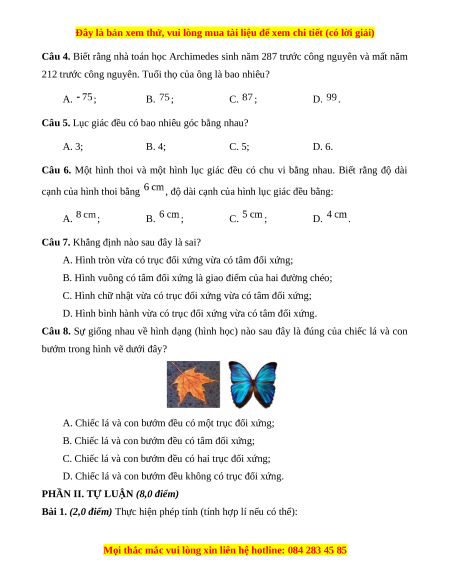 Câu 4. Biết rằng nhà toán học Archimedes sinh năm 287 trước công nguyên và mất năm