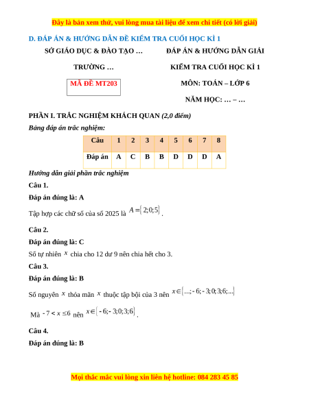 D. ĐÁP ÁN & HƯỚNG DẪN ĐỀ KIỂM TRA CUỐI HỌC KÌ 1