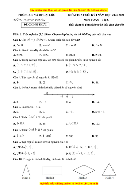 TRƯỜNG THCS PHAN BỘI CHÂU Môn: TOÁN – Lớp 6 ĐỀ CHÍNH THỨC