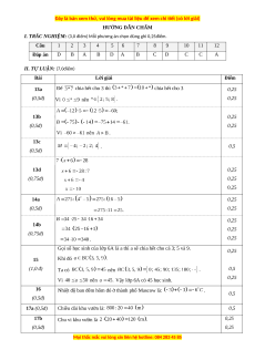 II. TỰ LUẬN: (7,0điểm) Bài Lời giải Điểm 13a Để chia hết cho 3 thì chia hết cho 3 0,25 (0,5đ) Vì nên 0,25 13b 0,25 (0,5đ) 0,25 Vì nên . 13c . 0,5 (0,5đ) 13d 0,25 (0,75đ) 0,25 0,25 14a 0,25 (0,5đ) 0,25 0,25 14b 0,25 (0,75đ) . 0,25
