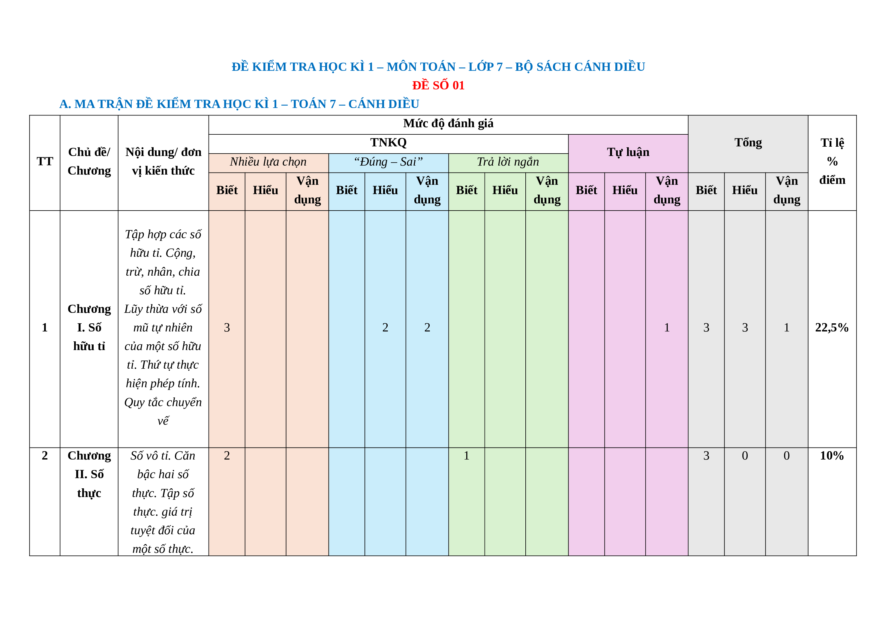 B. BẢN ĐẶC TẢ ĐỀ KIỂM TRA HỌC KÌ 1 – TOÁN 7 – CÁNH DIỀU