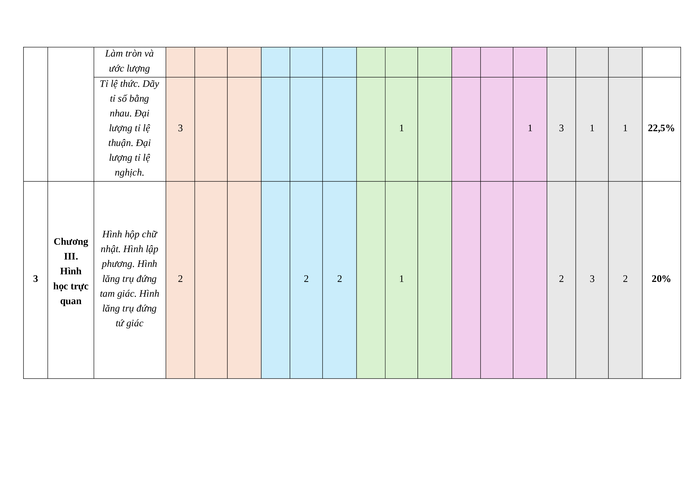 tỉ. Thứ tự thực hiện phép tính. Quy tắc chuyển vế 2 Chương Số vô tỉ. Căn 2 1 3 0 0 10% II. Số bậc hai số thực thực. Tập số thực. giá trị tuyệt đối của một số thực. Làm tròn và ước lượng Tỉ lệ thức. Dãy tỉ số bằng nhau. Đại lượng tỉ lệ 3 1 1 3 1 1 22,5% thuận. Đại lượng tỉ lệ nghịch. Hình hộp chữ