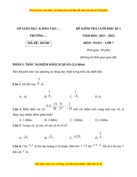 NĂM HỌC 2022 – 2023 MÃ ĐỀ: MT205 MÔN: TOÁN – LỚP 7 Thời gian: 90 phút