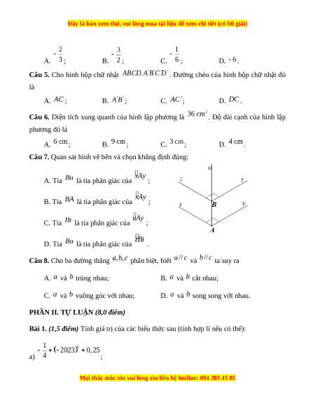 Câu 1. Số đối của là A. –8; B. ; C. ; D. 8.