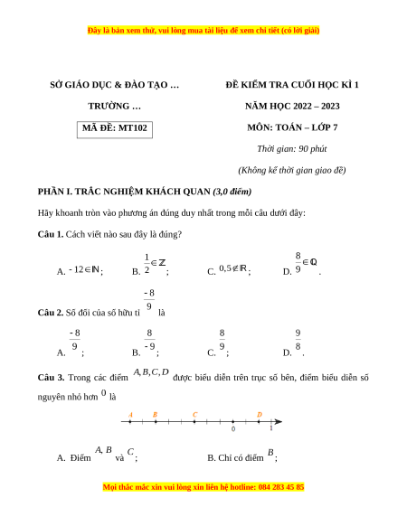 NĂM HỌC 2022 – 2023 MÃ ĐỀ: MT102 MÔN: TOÁN – LỚP 7 Thời gian: 90 phút
