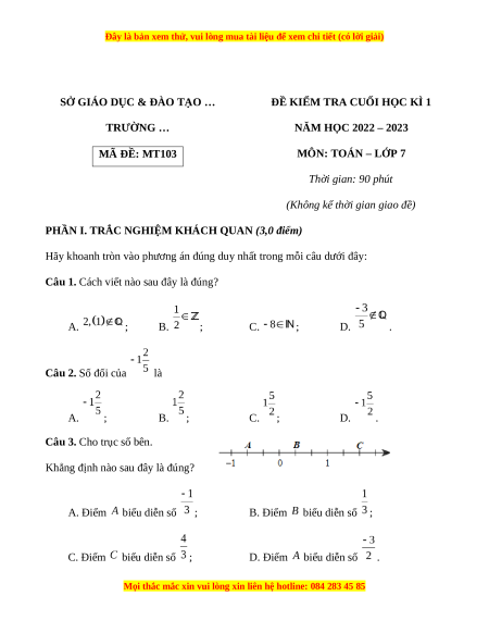 NĂM HỌC 2022 – 2023 MÃ ĐỀ: MT103 MÔN: TOÁN – LỚP 7 Thời gian: 90 phút