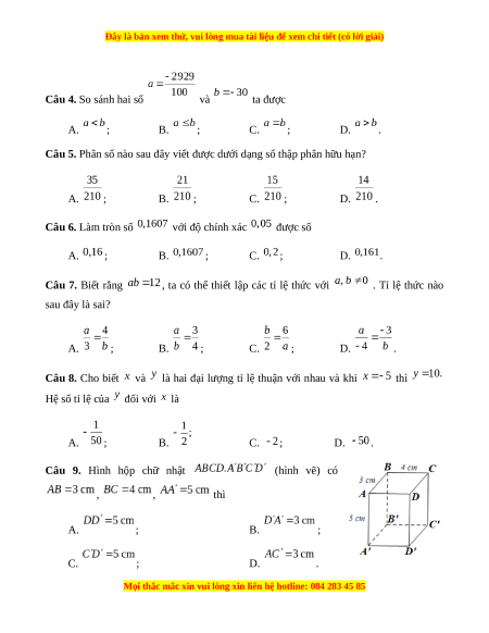 Câu 4. So sánh hai số và ta được A. ; B. ; C. ; D. .