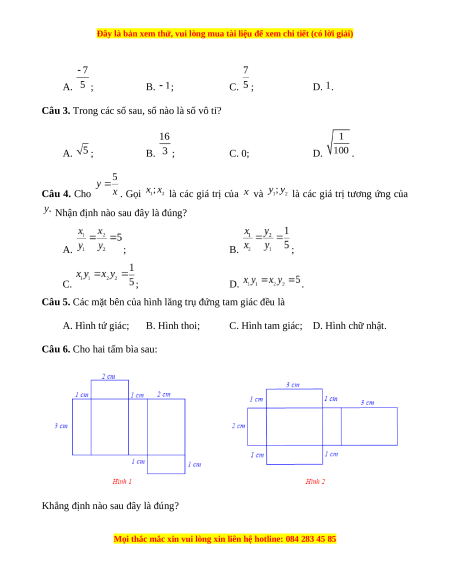 Câu 3. Trong các số sau, số nào là số vô tỉ? A. ; B. ; C. 0; D. . Câu 4. Cho . Gọi