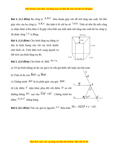 ty nhận được (chia theo tỉ lệ góp vốn) biết sau một năm mở rộng sản xuất thì ba công ty lãi được tổng tỉ đồng.
