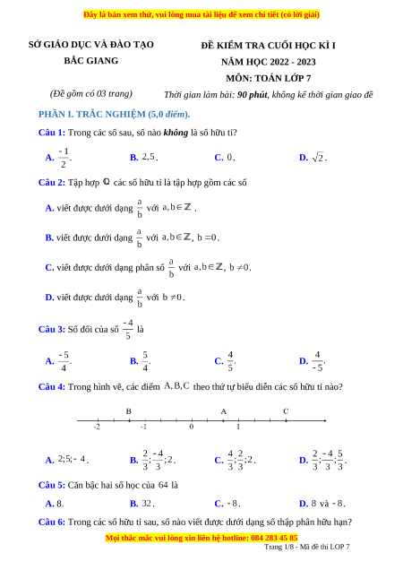 ĐỀ KIỂM TRA CUỐI HỌC KÌ I BẮC GIANG NĂM HỌC 2022 - 2023 MÔN: TOÁN LỚP 7