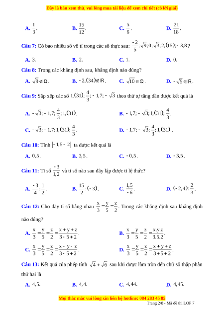 theo thứ tự tăng dần được kết quả là A. . B. . C. . D. . Câu 10: Tính ta được kết quả là A. . B. . C. . D. . Câu 11: Tỉ số