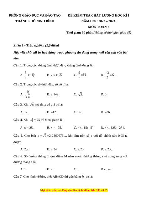 Đề thi cuối kì 1 Toán 7 Cánh diều tỉnh Ninh Bình